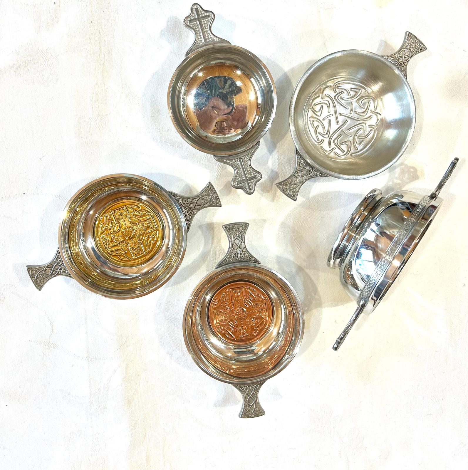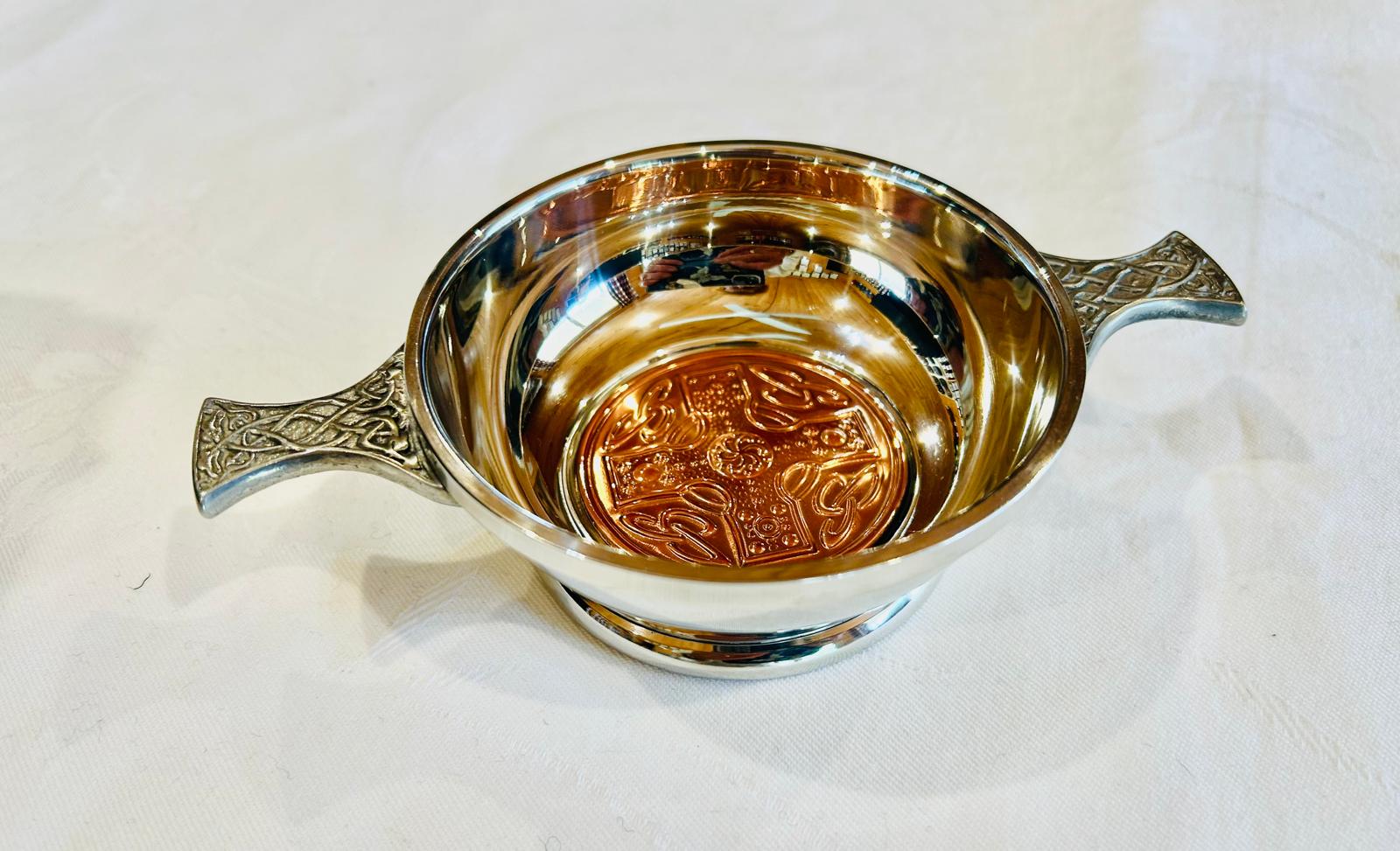 The Quaich (from Gaelic cuach, “cup”) is a traditional Scottish two-handled shallow drinking vessel, emerging in the Highlands around the 16th century. Originally crafted from wood, horn, or silver-mounted staves, it was used for whisky or brandy, acting as a “cup of friendship” to welcome visitors.